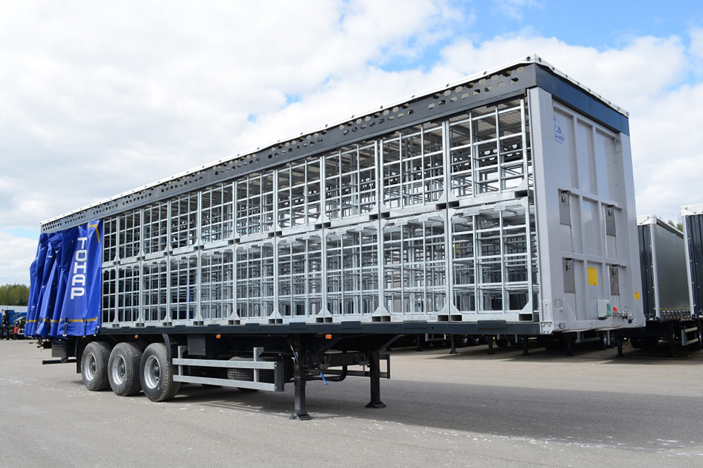 Тентовый полуприцеп с подъемной крышей и сдвижными боковинами для перевозки птиц на убой, в металлических контейнерах различных производителей.