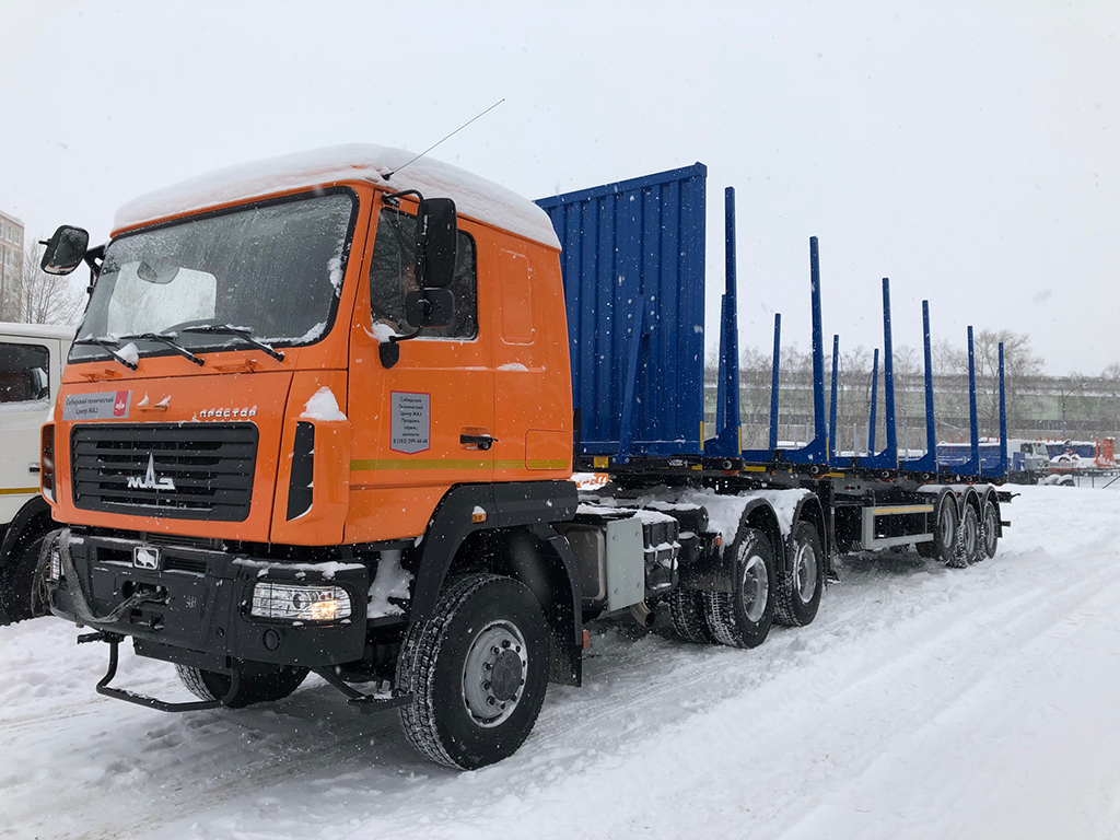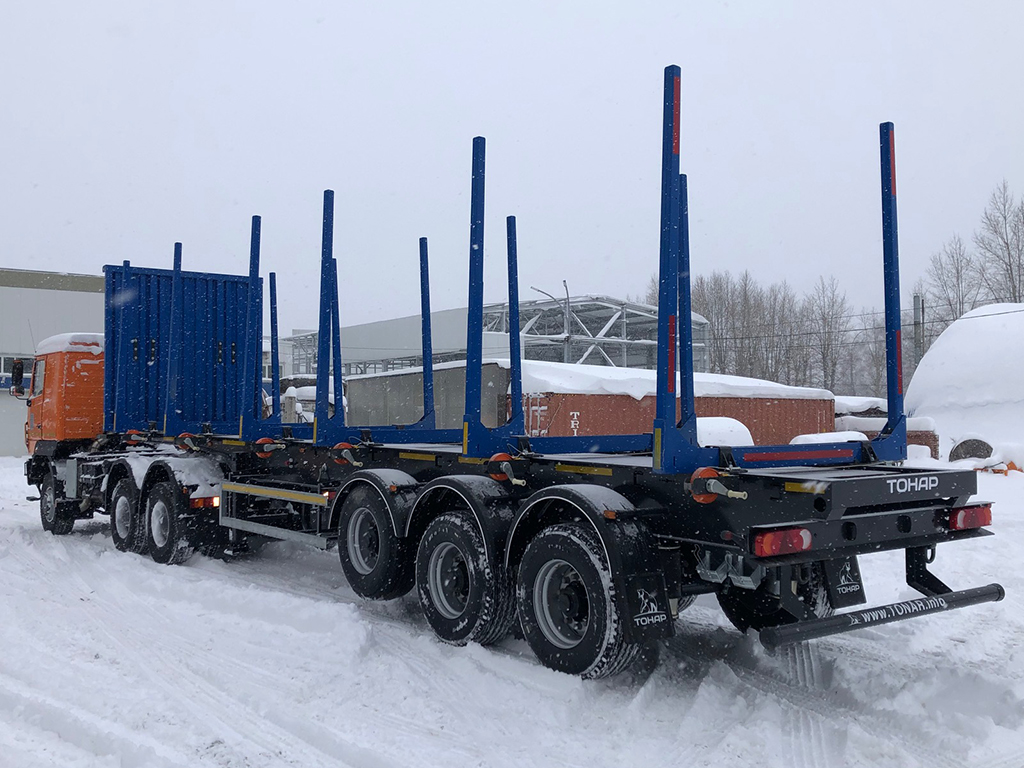 - Посуприцеп-сортиментовоз Тонар-9445, 3-х осный, облегченный, объем перевозимого леса до 58 м3, собственный вес всего 6300 кг.